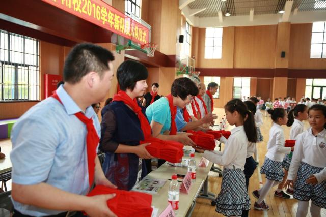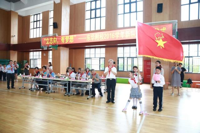 6月1日,“立志向,有梦想”——东华附校2016学年新队员入队仪式在东华附校举行,400多名东华附校二年级小学生在这一天戴上了鲜艳的红领巾,成为一名光荣的少先队员。校关工委副主任浦解明老师出席活动,并代表关工委老同志为附校孩子们授中队旗。我校关工委老同志代表俞保安老师、范崇文老师、贺善侃老师、刘玉老师、王依民老师及党委组织部胡琳老师,东华附校校长周卫斌,副校长张云洁、高晓红、李燕华等行政领导,以及附校家长代表和二年级全体师生参加了入队仪式。