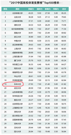 7月19日,“2017中国高校体育竞赛榜”正式发布,综合各项指标,我校在该榜单位列第19名,这也是我校首次进入榜单前20名。