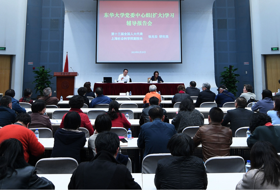 3月29日,校党委理论学习中心组召开党委理论中心组(扩大)学习会,邀请第十三届全国人大代表、上海社会科学院副院长张兆安研究员作学习贯彻2019年全国两会精神专题辅导报告。学习会由党委副书记刘淑慧主持。