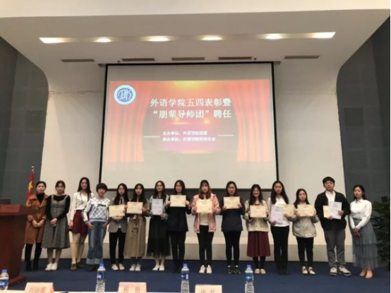 “朋辈互促传青春活力”。为庆祝五四运动一百周年,2019年4月30日,外语学院学生党支部协同学院团委在五四青年节到来之际举办了首届以“榜样引导正能量”为主题的五四表彰暨“外语学院第一届传承者”遴选活动,在“志愿服务”、“社会实践”、“学习典范”、“工作楷模”四大领域共计遴选出11名青年榜样,以青年党员朋辈群体的力量感染辐射带动身边的团员青年,取得了广泛的引领示范效应。