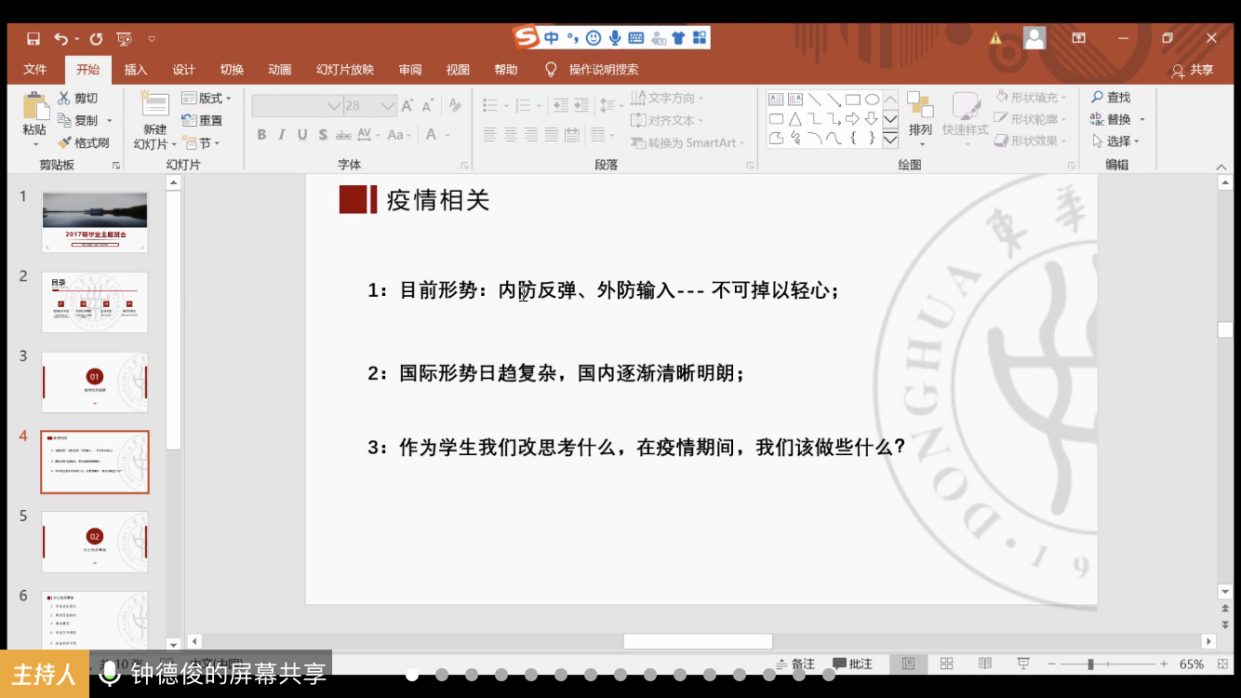 辅导员钟德俊代表学院问候大家,并嘱咐大家在家要继续自我隔离,注意个人安全防护,尽量少外出,在疫情的最后阶段也不能放松,遵守学校及当地政府的各项通知要求。在线班会互动,对持续加强学生防疫意识、增强学生抗击疫情的信心和能力发挥重要作用,营造了防疫情、鼓士气、筑同心的良好氛围,在云端传递出温暖和正能量。钟老师还介绍了当前学校、学院针对疫情情况的各项政策、通知,给大家带来了信心,相信在国家、学校、学院的正确决策部署下,大家一定能在春暖花开时,集聚美丽校园。