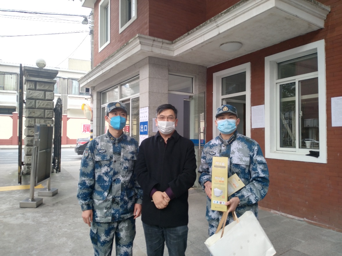 (张义红老师向上海市空军基地防疫一线的执勤哨兵捐赠口罩)
