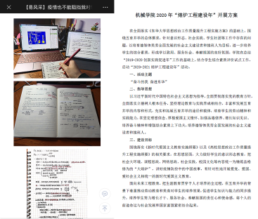 学院认真落实“停课不停学、停课不停教”的要求,带领学生在线学习,帮助学生答疑解惑,促进学生在战“疫”中思想、学业同进步。开展《战“疫”同心,致学同行——如何做好线上学习不掉队》和《疫情之下,就业我来帮》等微课,为非毕业班同学指导线上学习要点,为毕业班同学春季校园招聘提供助力。组建师生咨询群、了解学生对在线教学的感受和评价、开展优秀学生笔记征集等,让机械师生携手“云端”,共同上好在线教学课程。