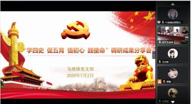 7月2日,马克思主义学院马理硕党支部举行了“学四史 促五育 悟初心 践使命”调研成果展示会。本次成果展示会采用线上与线下相结合的方式,充分结合“四史”学习教育要求,展示了同学们在各自家乡开展“四史”文化社会实践调研的成果。学院关工委常务副主任张怡,关工委委员贺善侃、陈敬铨,兼职辅导员陈健、张乂凡,专职辅导员于小越参加会议。活动由学院党总支副书记资雪琴主持。
