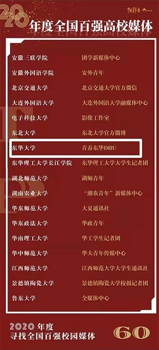3月23日,由中国青年报社、中国青少年新媒体协会、中青校媒联合开展的“2020年度寻找全国百强校园媒体”活动获奖名单正式发布,我校团委官方微信公众号“青春东华DHU”荣获“2020年度全国百强高校媒体”称号。