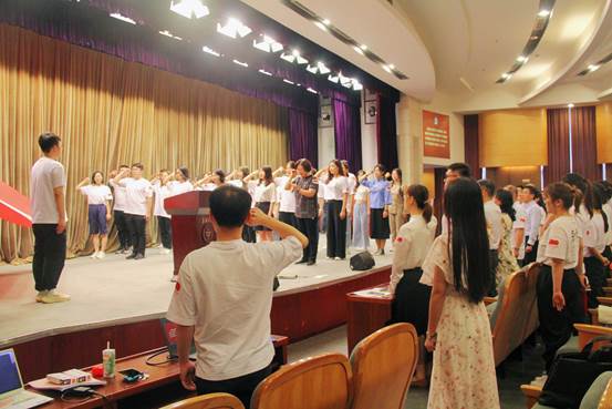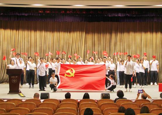 丁霞萍带领29位新党员在党旗下郑重宣誓,全体师生党员重温入党誓词,号召全体师生党员永葆政治本色、永葆革命和奋斗精神,牢记为人民服务的初心使命。