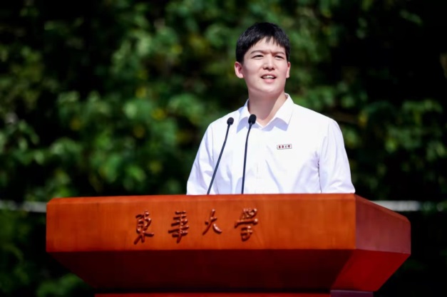 在校生代表、纺织学院2020级研究生王天增以自己五年的东华求学经历,为新生送上真挚寄语:勇于实践、勇于创造,不辜负青春年华,在中华民族伟大复兴的奋斗征程中发出东华人的时代最强音。