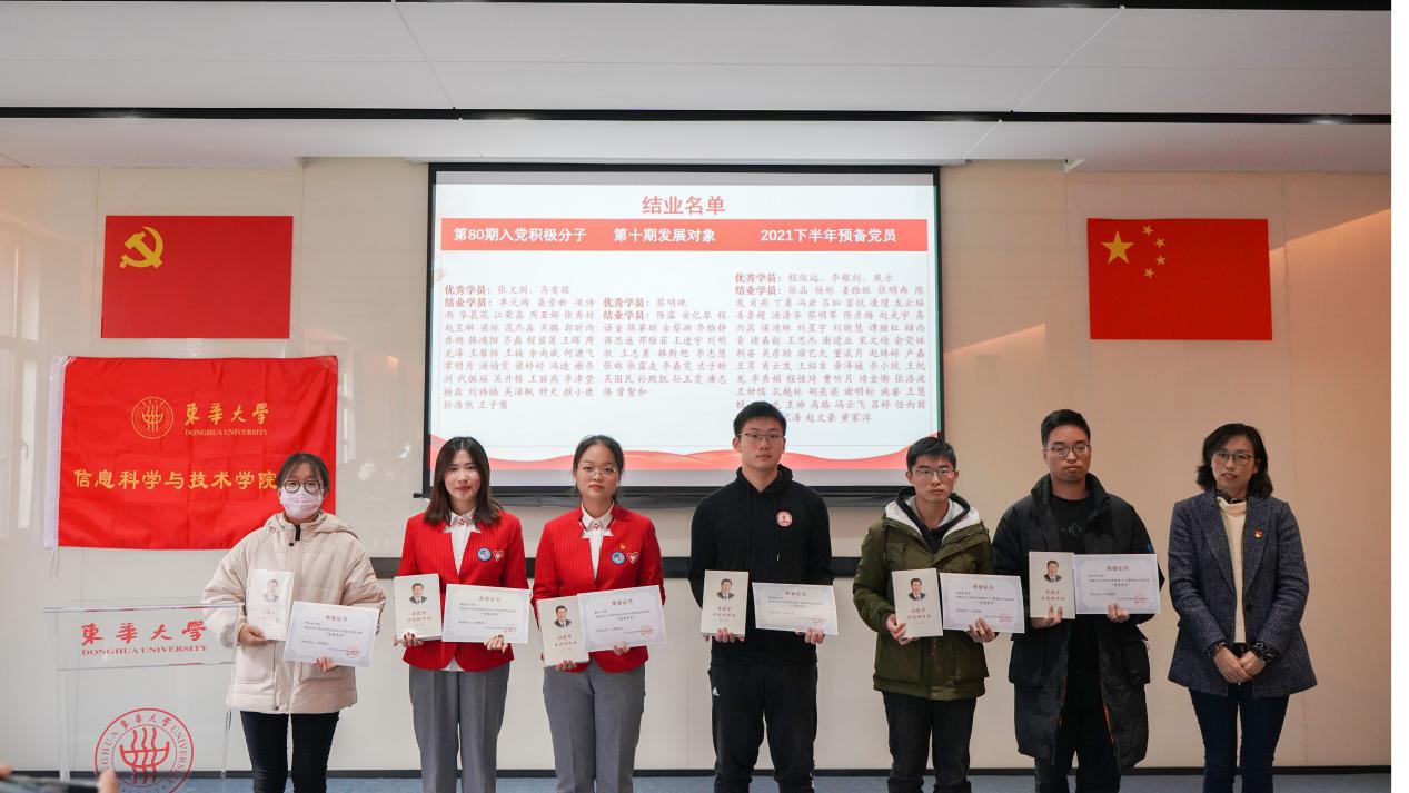 结业典礼上,信息学院发展对象培训班学员代表蔡明珠同学发言,她表示党校为期一个月的培训,为学员们指明了发展的方向,拓宽了前进的道路,作为新时代新青年,应当弘扬伟大建党精神,勿忘昨日苦难辉煌,无愧今朝使命担当,不负明天伟大梦想。信息学院党校学员代表戴乐分享第四届进博会的志愿服务经历,她表示将时刻牢记“实践入党初心,服务报效祖国”,带着在进博的这股冲劲冲锋在前,展现青年党员志愿者良好的精神面貌。分享完毕后,五位党校小叶子朗诵诗歌《共产党员的名字叫奉献》,致敬共产党员服务群众,服于基层,时刻履行职责,献身神圣事业的伟大品格。