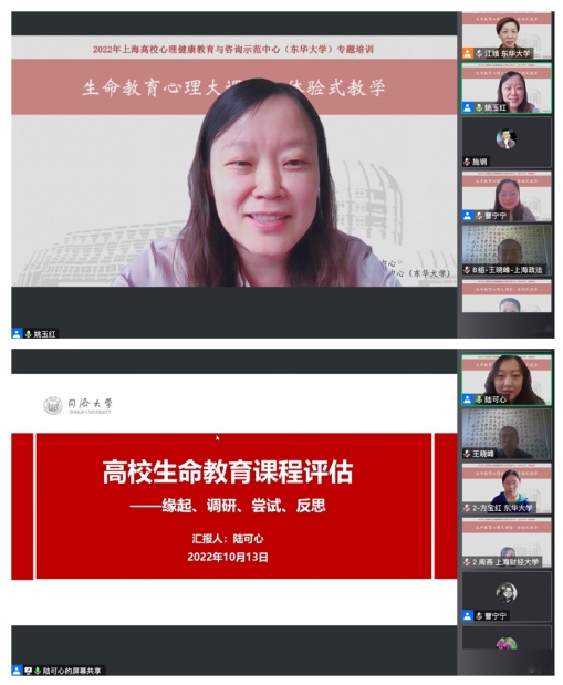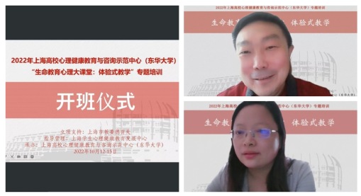10月12日-15日,由上海高校心理健康教育与咨询示范中心(久久久久国产成人精品亚洲综合)承办的2022年度“生命教育心理大课堂:体验式教学”专题培训在线上顺利举行。10月12日,我校心理健康教育与咨询中心主任曹宁宁主持开班式,来自上海交通大学、华东师范大学、华东理工大学、上海师范大学等40所高校的72名心理教师和心理辅导员齐聚云端,开启4天的系统学习。培训围绕心理健康和生命教育互动体验课堂的教学理念、设计思路、示范讲解等内容展开,学员分组进行实操性学习、实践与演练。