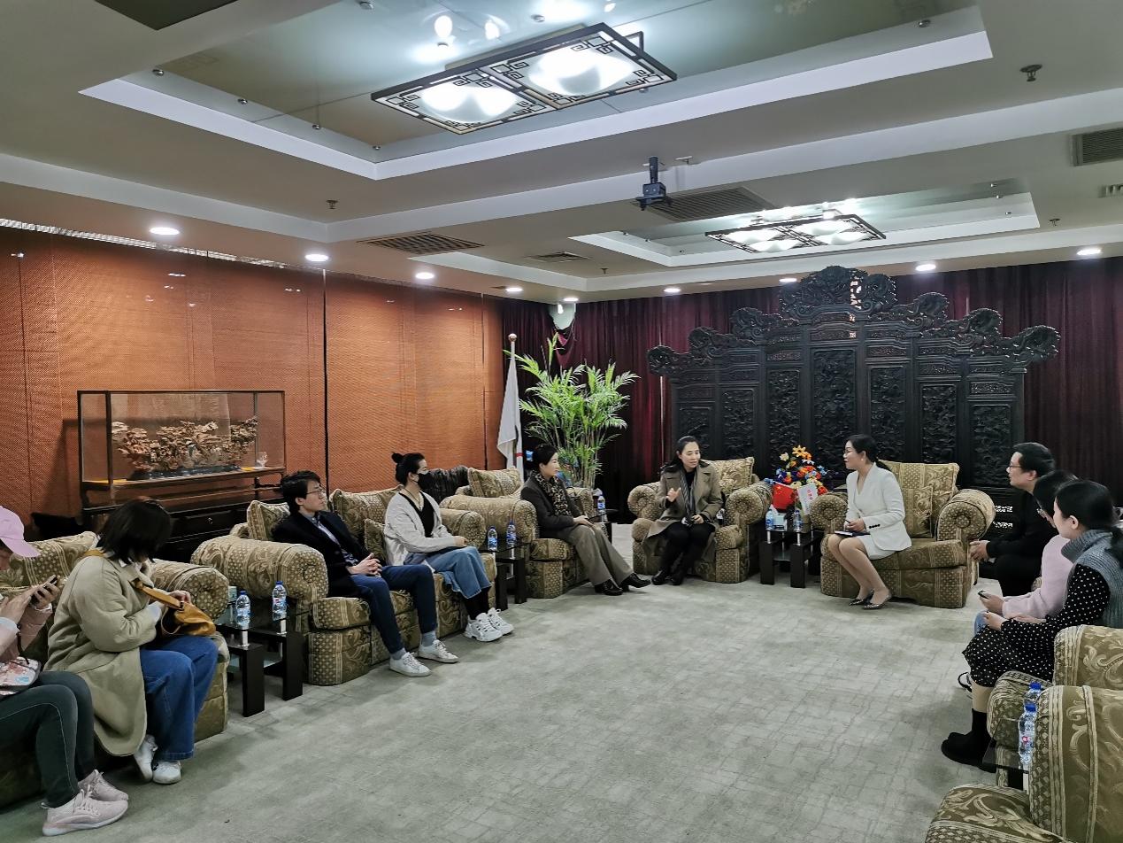 其后,回访小组与恒源祥集团党委书记顾红蕾等进行了座谈。顾书记向老师们介绍,恒源祥集团目前有上海绒绣和海派绒线编结技艺两个非遗工作室,工作室除了完成日常订单制作外,还致力于非遗教育与传承事业,多次与学校合作开展项目:建党百年时,恒源祥与各中小学、高校合作,开展共绣党旗活动,提供绣制工具、绒绣培训,绣制了百面党旗;今年三月,恒源祥集团联合全国雷锋学校大联盟的师生编织“雷锋花”,献给中共一大纪念馆收藏以及装点雷锋纪念馆的花篮,致敬雷锋精神。柯玲表示,这些特色活动将非遗传承与学校德育相连接,展现了非遗教育传承中企业宝贵的文化担当精神,同时感谢在自己主持的上海绒绣相关课题研究中恒源祥所给予的支持和帮助,并赠送了课题研究又一学术成果《上海绒绣研究》(艺术人像)分册。张顺爱老师惊喜地发现,恒源祥的非遗传承实践案例是很好的课程思政素材。